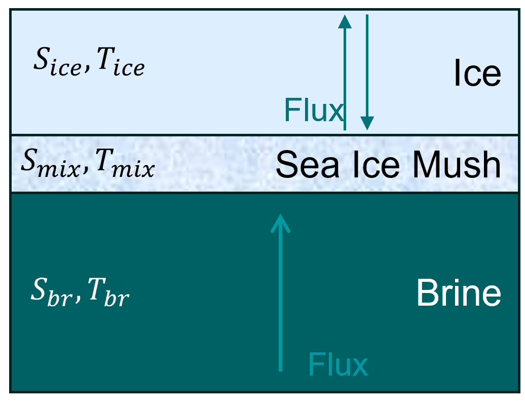 Brine in a sea ice system propagates along a vertical column and the flux across boundaries is considered to be constant (CHECK!!) as shown in Fig(). The Dirichlet boundary conditions (essential boundary condition) is implemented at the top layer of the vertical column and the system is assumed to be at melting temperature of sea ice as (2):.